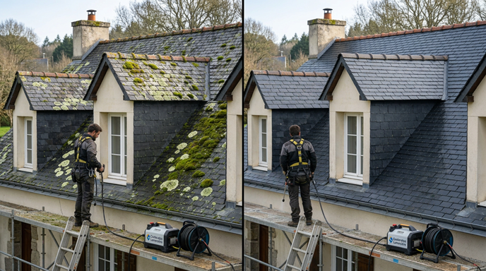Brossage ou nettoyage à pression maîtrisée selon le matériau et son état. L’objectif : retirer mousses, lichens et dépôts, sans abîmer la couverture.