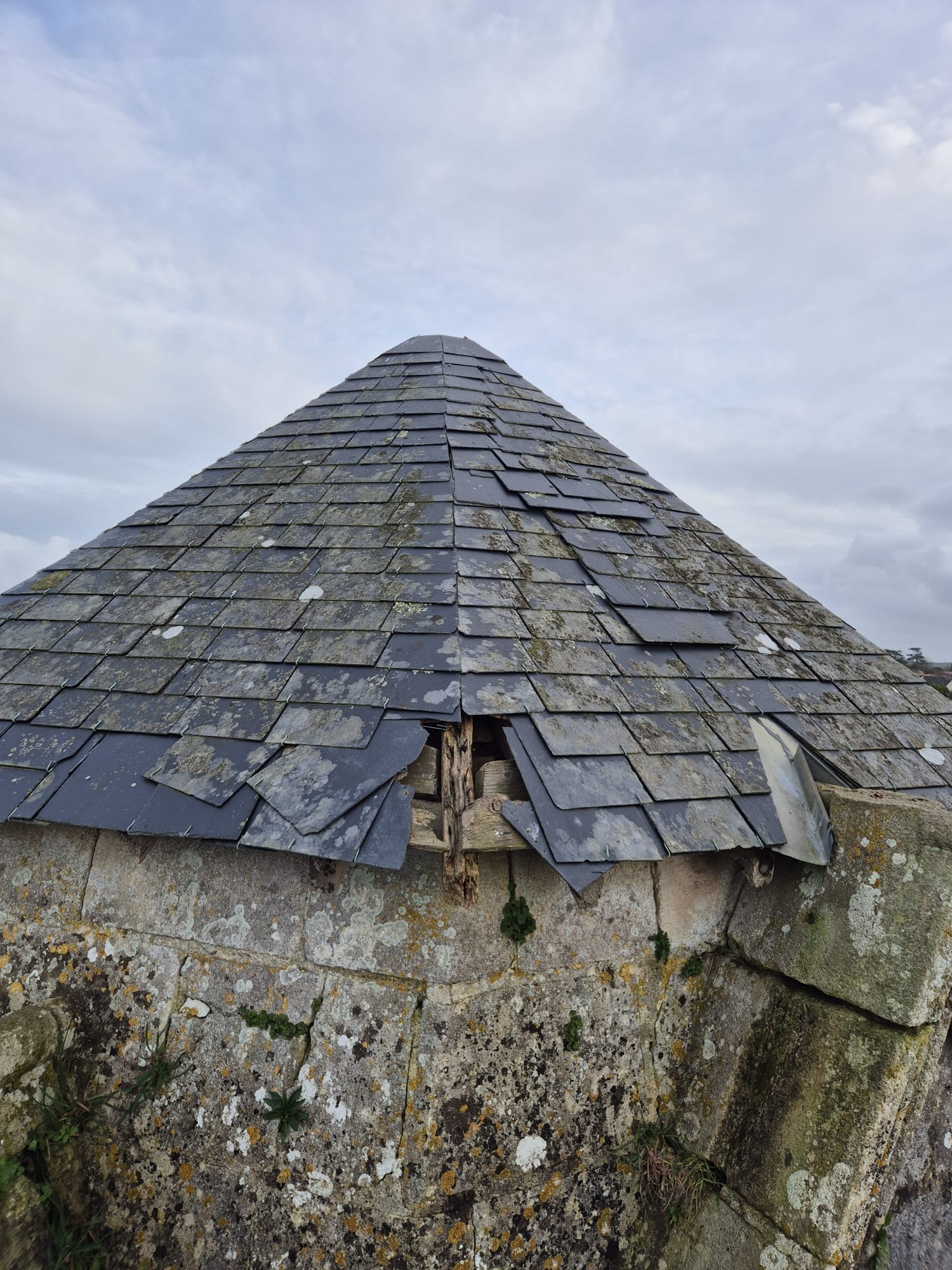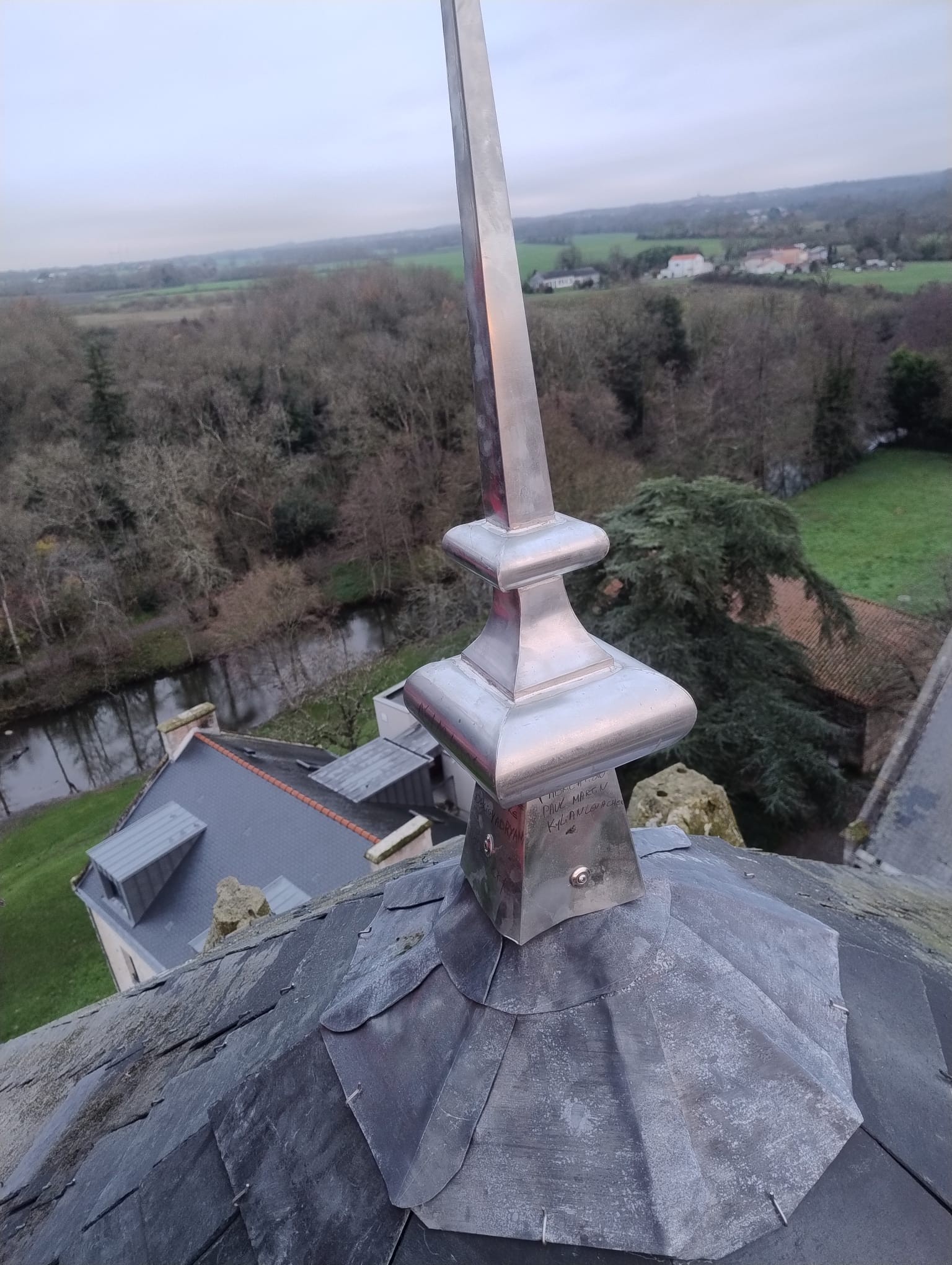 Petite anecdote qui donne une âme au chantier : sur l’ancien épi, l’inscription « 1990 » était visible, rappelant une ancienne intervention. Dans la tradition du métier, lorsqu’un couvreur intervient sur un édifice comme un château, une église ou un clocher, il est d’usage de laisser une trace : une date, parfois les noms des collaborateurs qui ont participé à la réparation.
