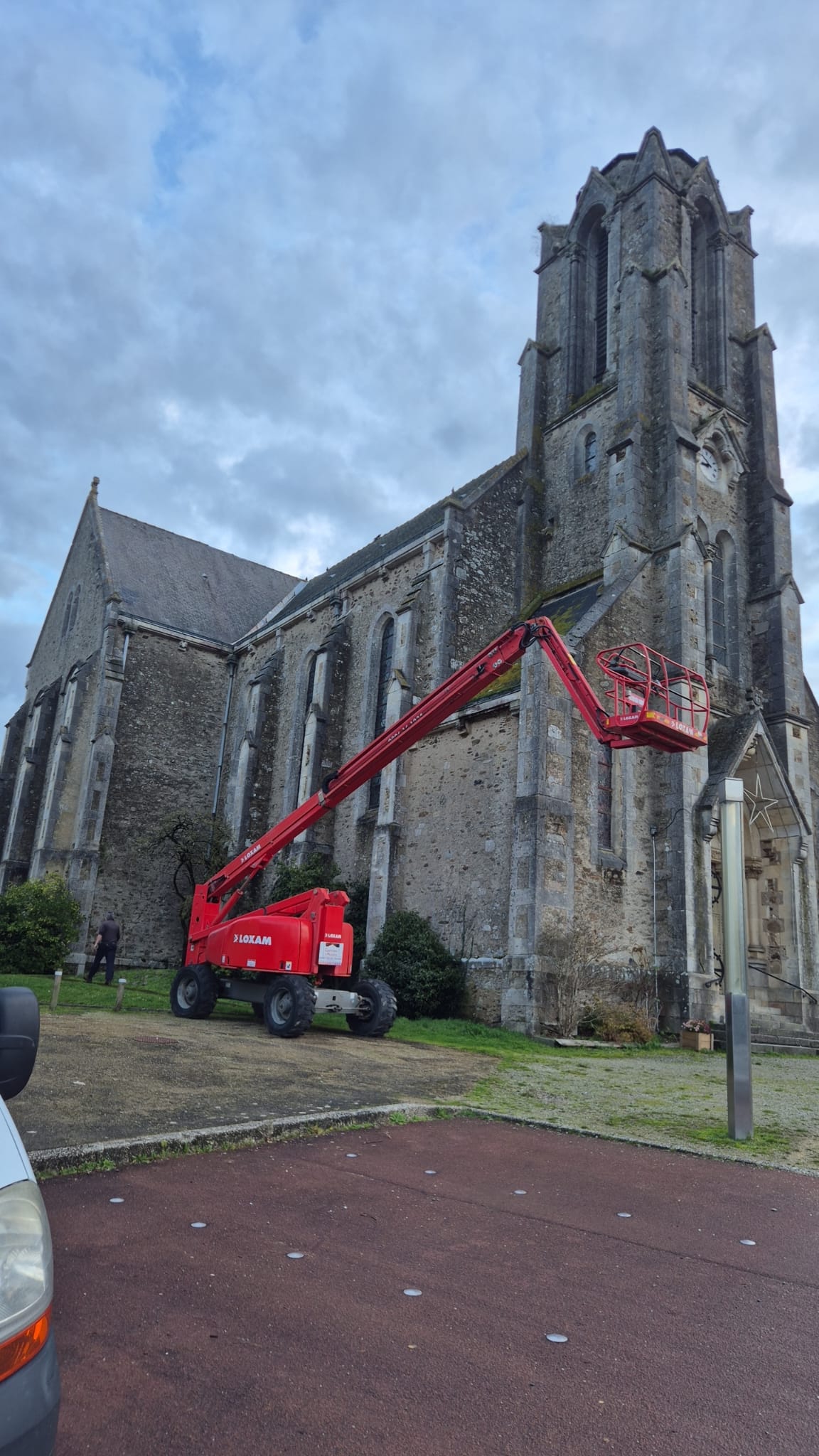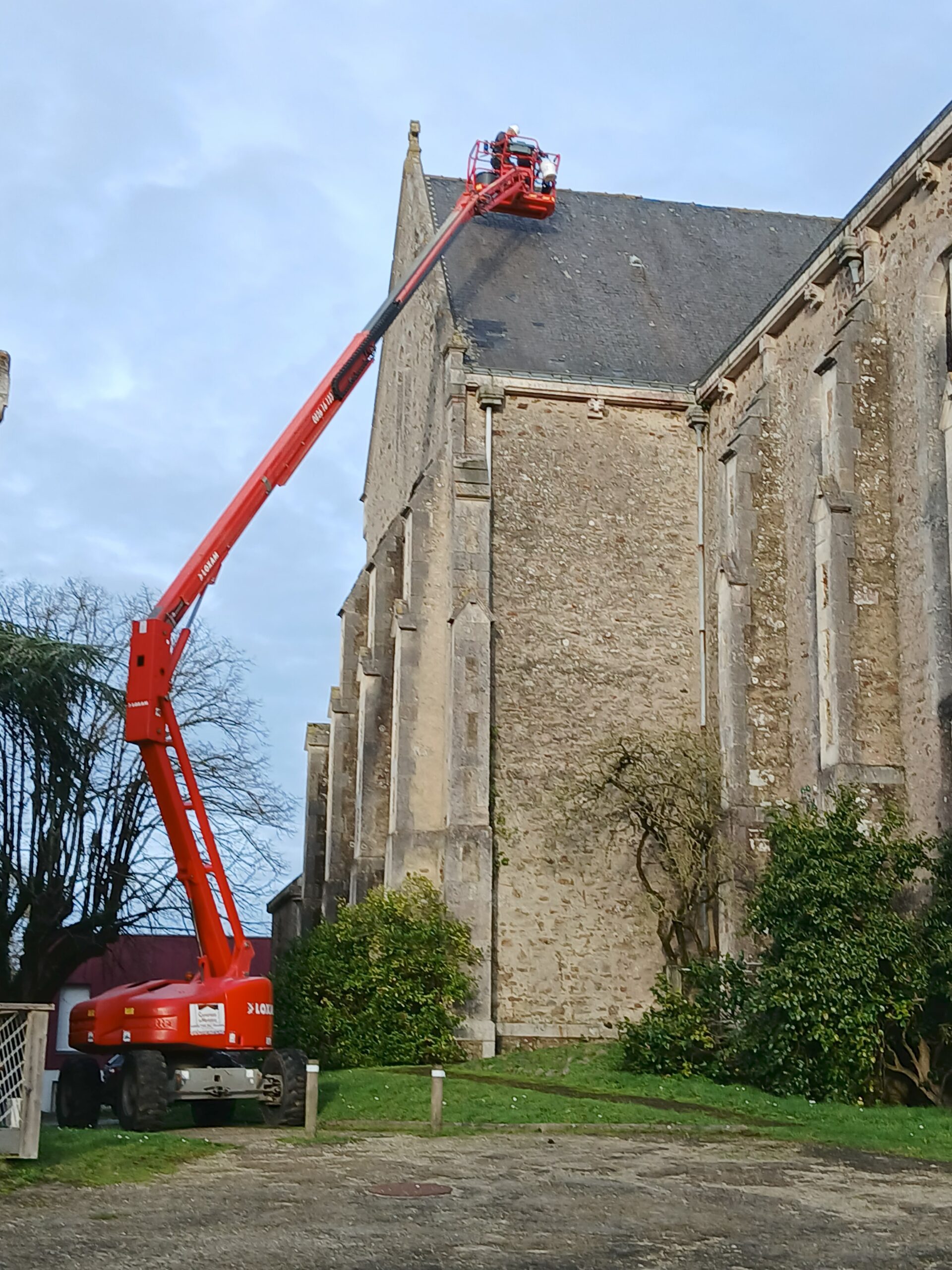 Pour atteindre le haut du clocher et les zones les plus difficiles d’accès, deux nacelles ont été louées : une de 26 mètres et une de 40 mètres. Ce choix permet d’adapter la hauteur en fonction des zones à traiter et de garantir la sécurité des équipes durant toute la durée du chantier.
